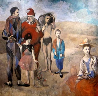 Ya en la transición hacia la Época Rosa, esta serie muestra artistas ambulantes y personajes de circo. Si bien hay más color, la melancolía persiste en las expresiones de los niños acróbatas, capturados en momentos de descanso y contemplación
