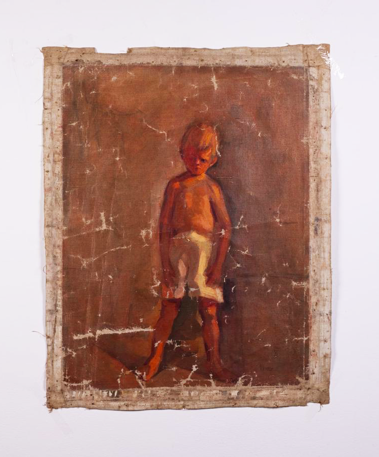 El niño ocupa el centro del lienzo, lo que concentra toda la atención del espectador. No hay elementos decorativos ni paisajes de fondo: solo el niño, en un espacio casi vacío, como suspendido en un limbo emocional. La luz tenue que incide sobre su torso destaca su figura, generando un contraste dramático con el entorno sombrío.